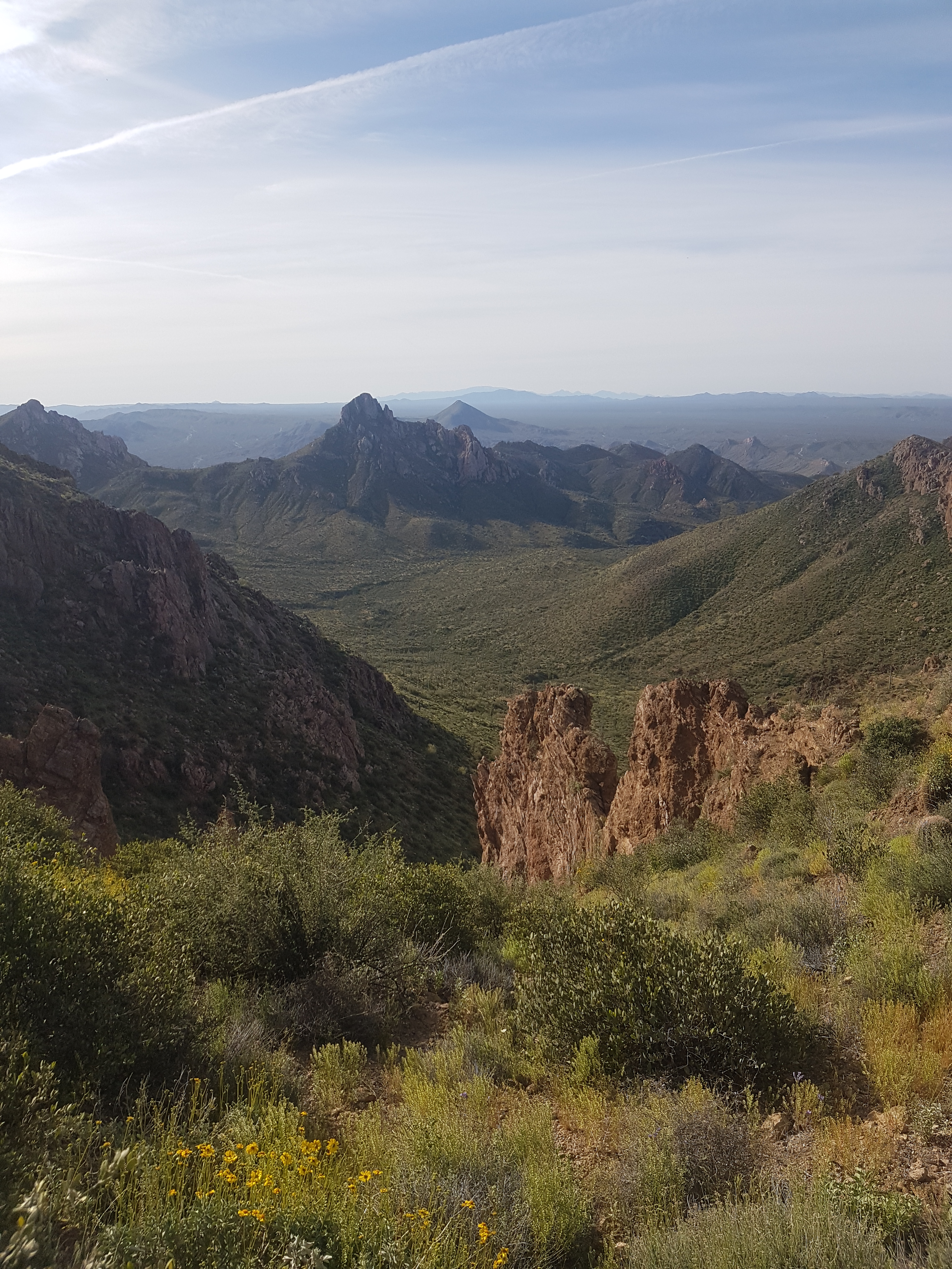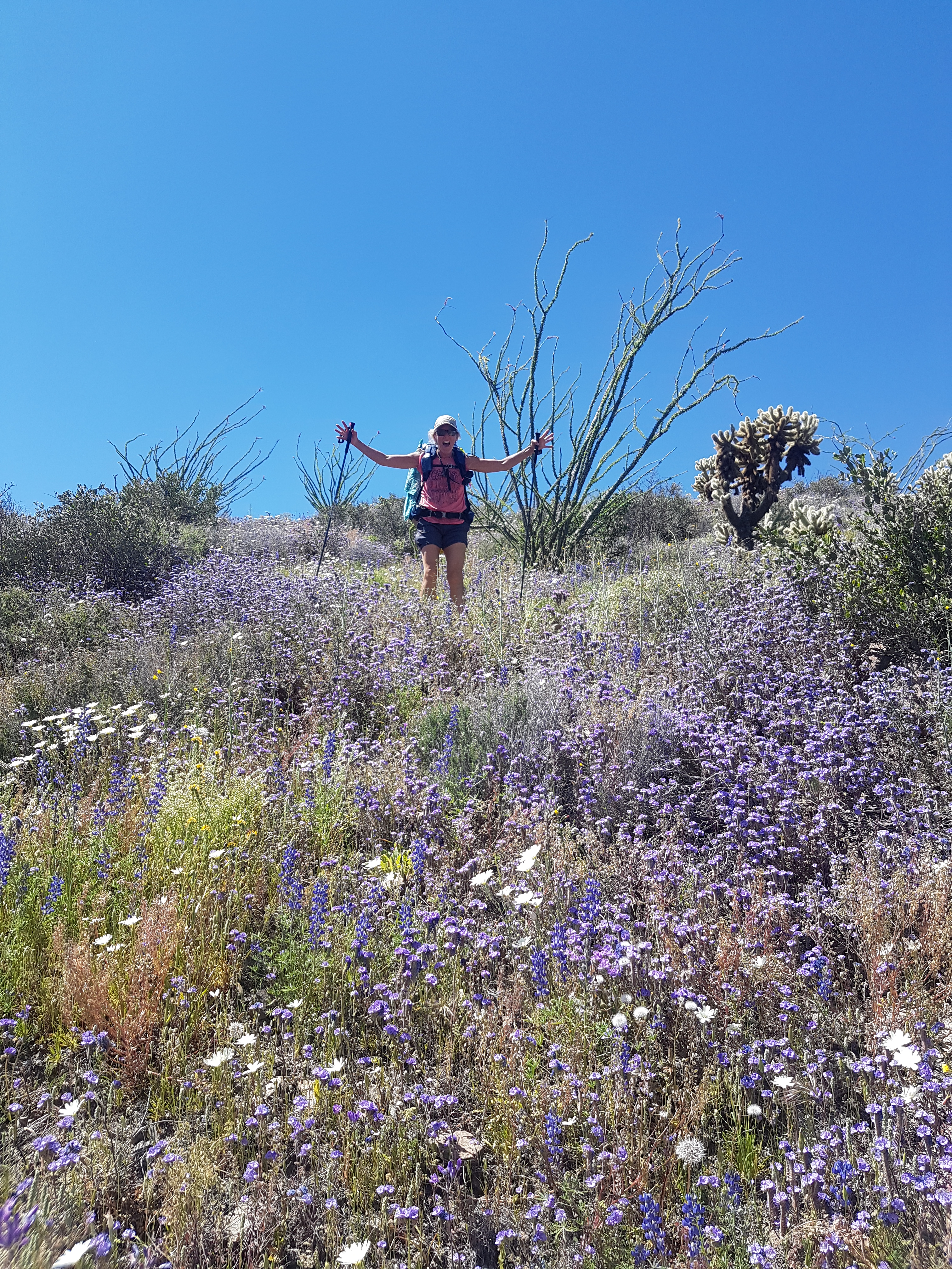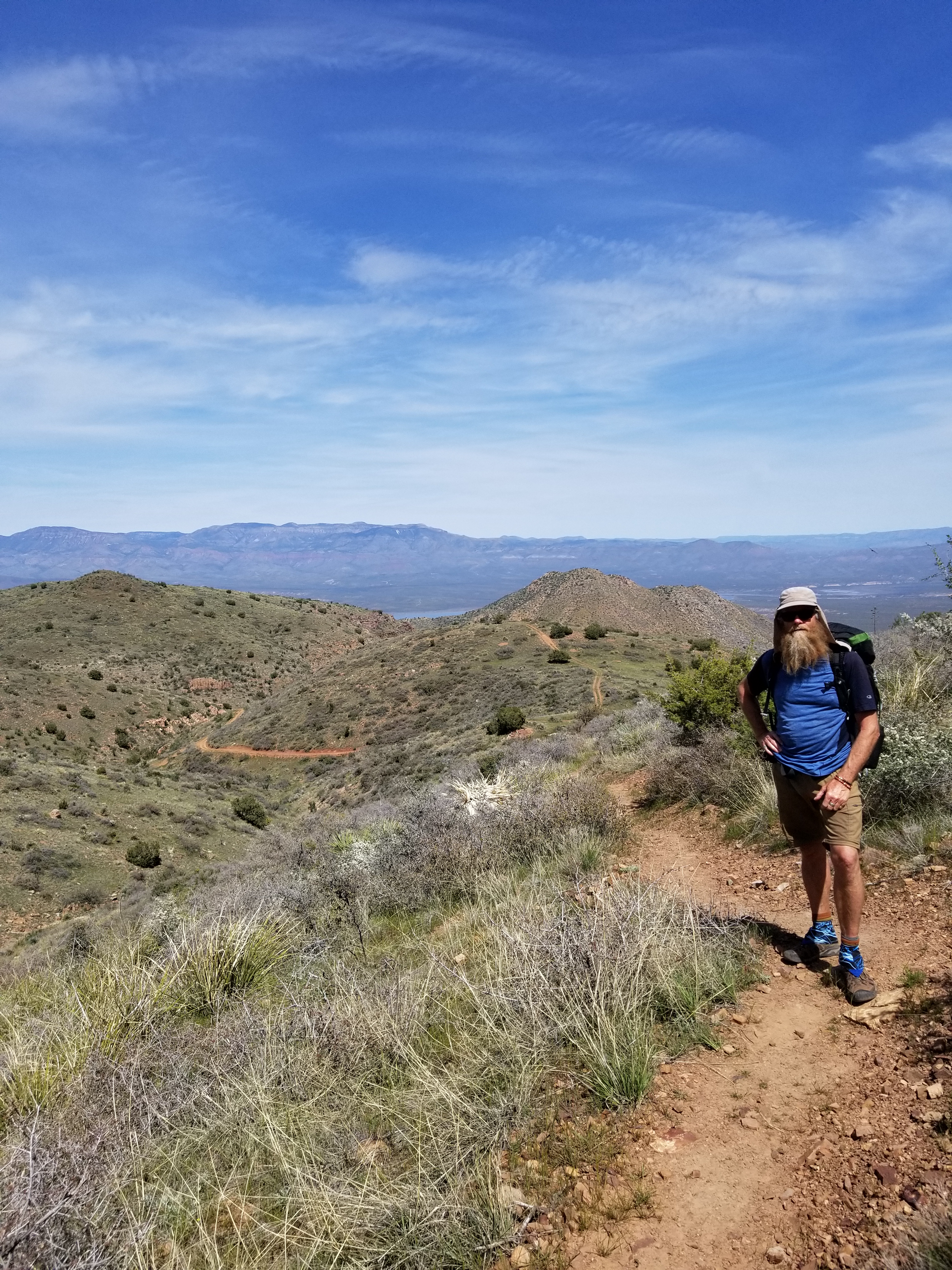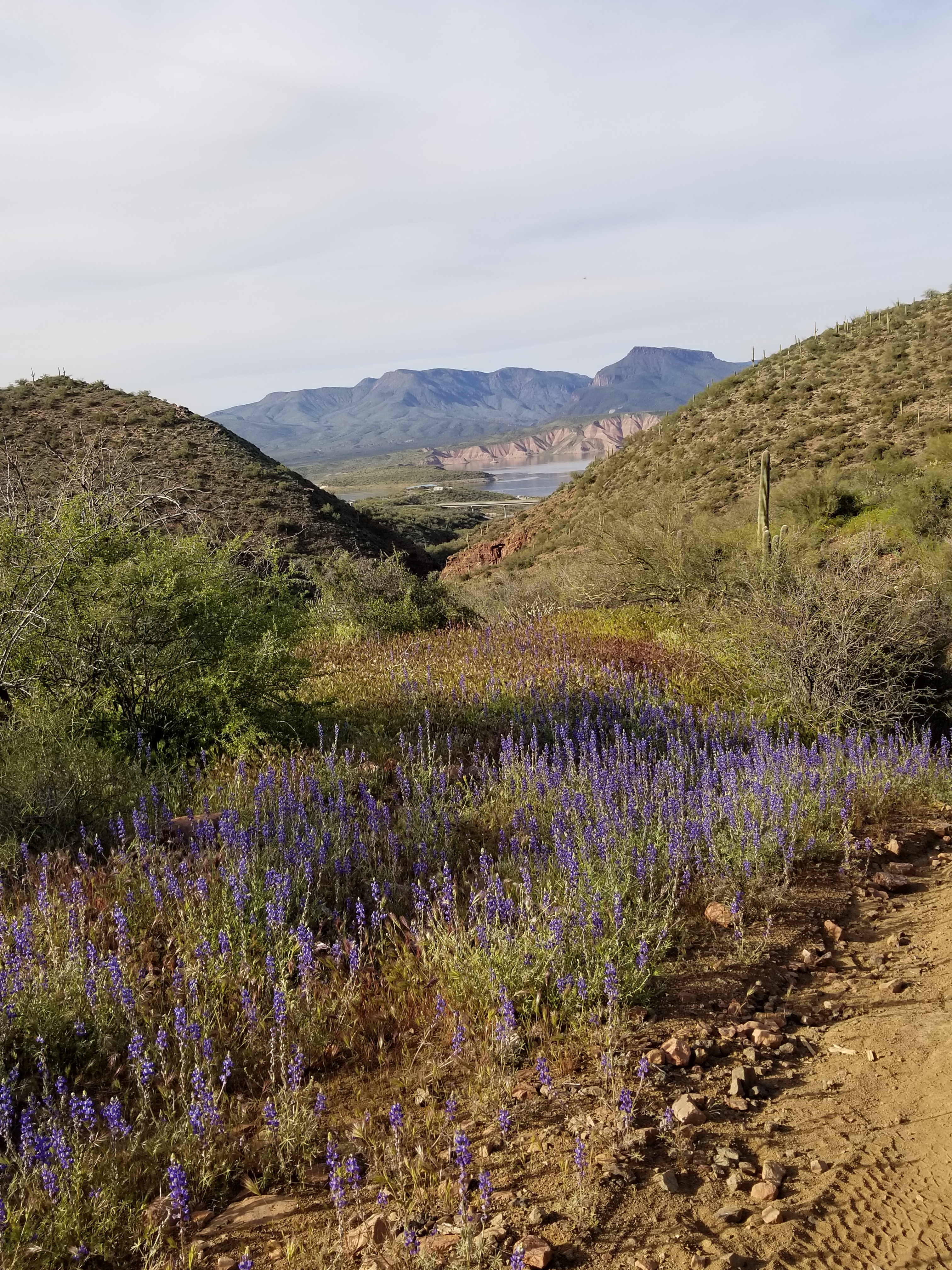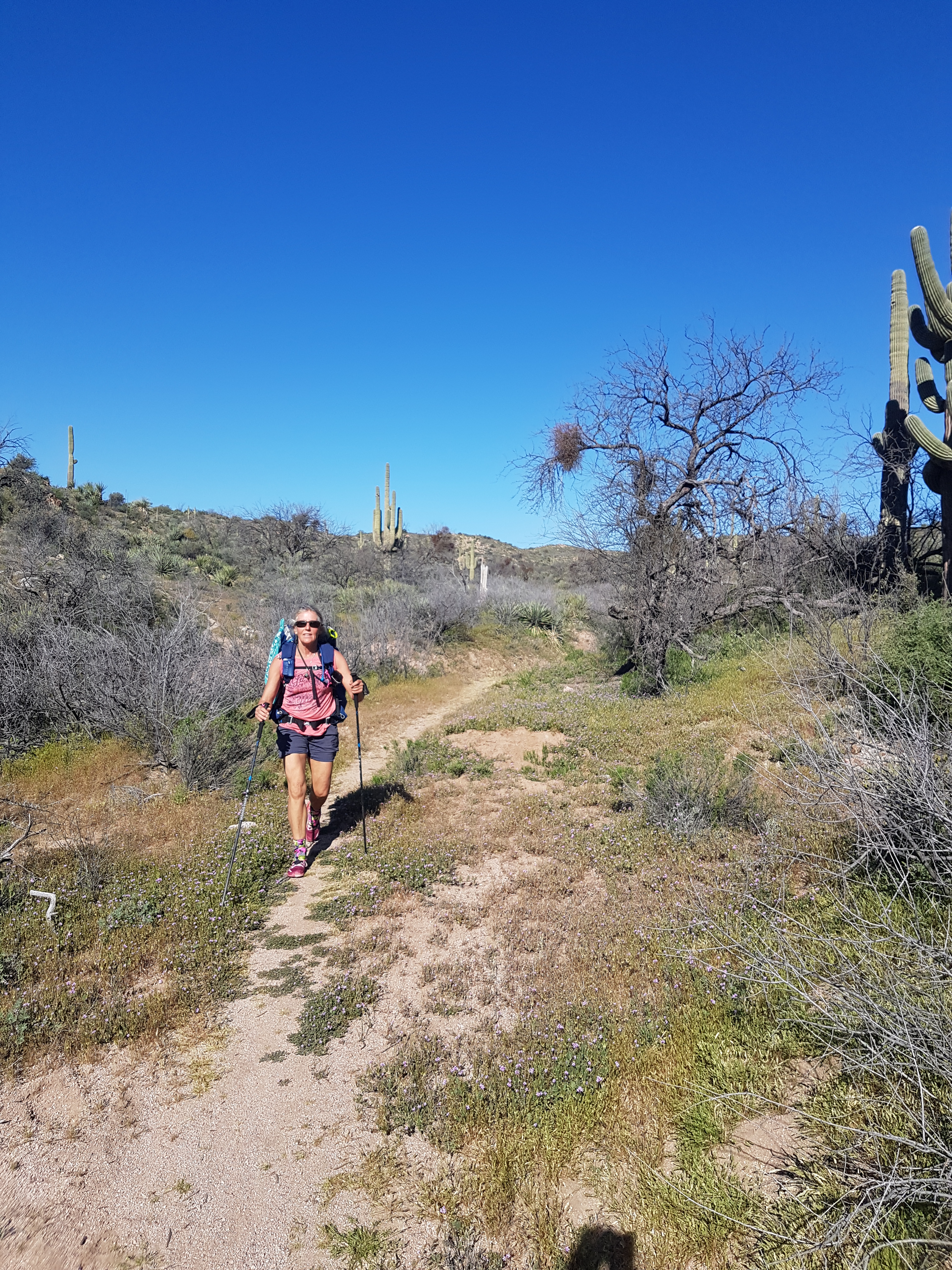 The trail goes from the town of Oracle to Roosevelt Marina during this stretch. The land changed from rolling open desert lands to flat ground to flowering hills near the Gila (pronounced Hila) River then through the Alamo Canyon and Superstition Wilderness.