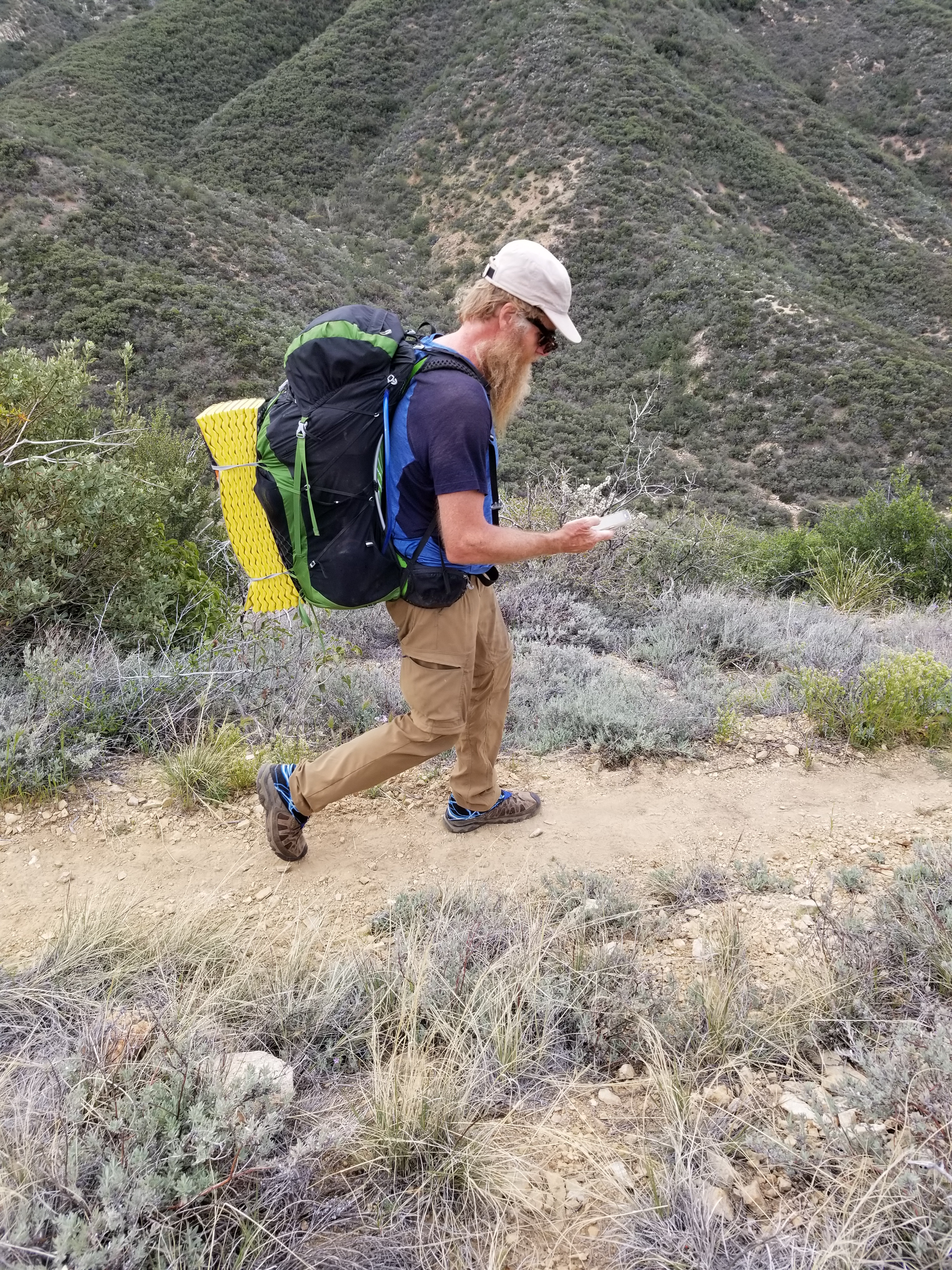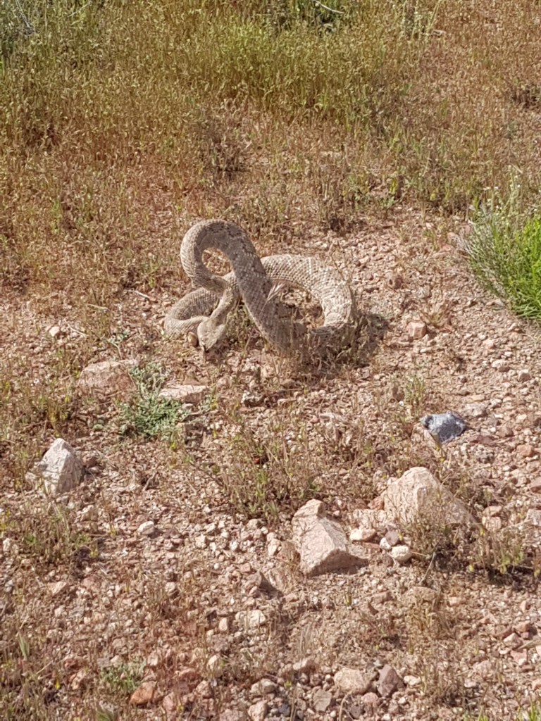 Jobie is navigating the trail through the “guthook” app as everyone else is. It covers the water sources and maps from his phone. From time to time he pulls out his cell to confirm our whereabouts. As he took his eyes off the trail for just a few seconds, he almost stepped on a huge rattler! The snake went into offensive, coiled, ready to strike mode as Jobie trip-jumped away in defensive “Holy Shit” mode.