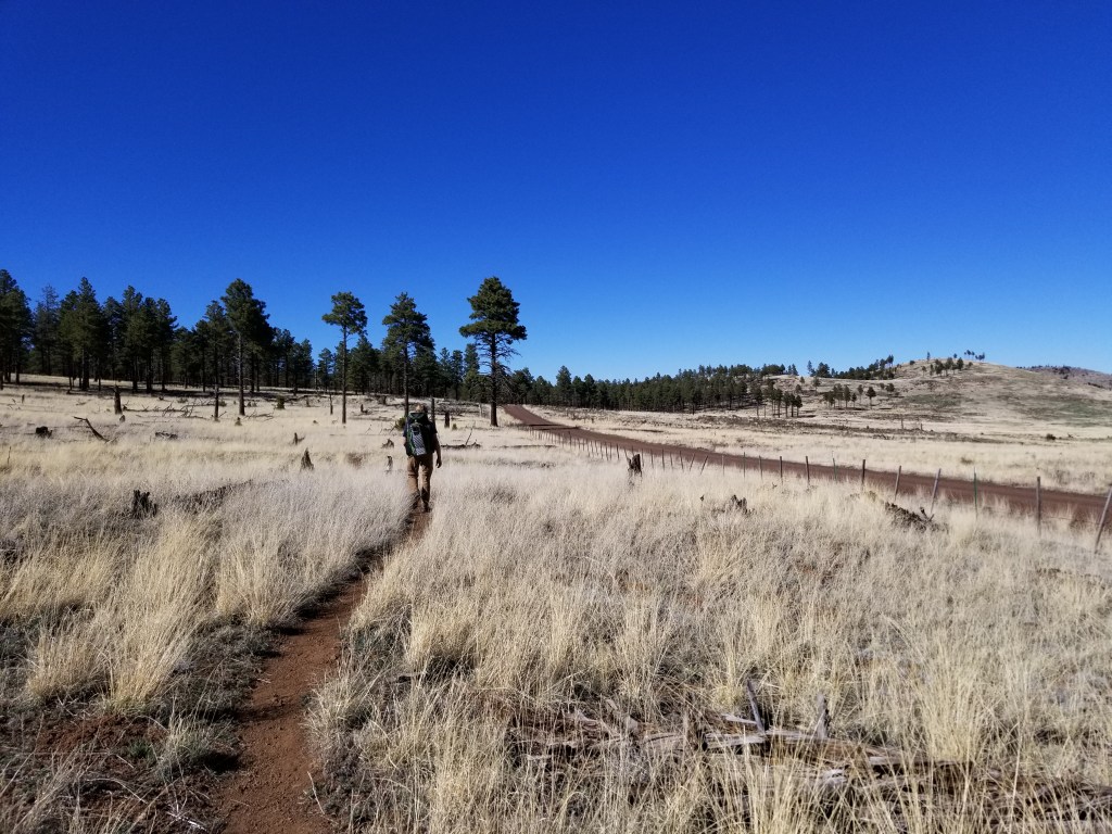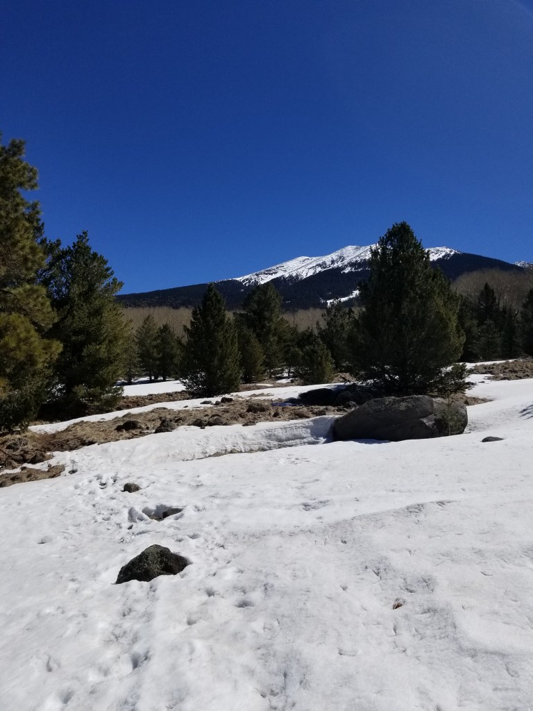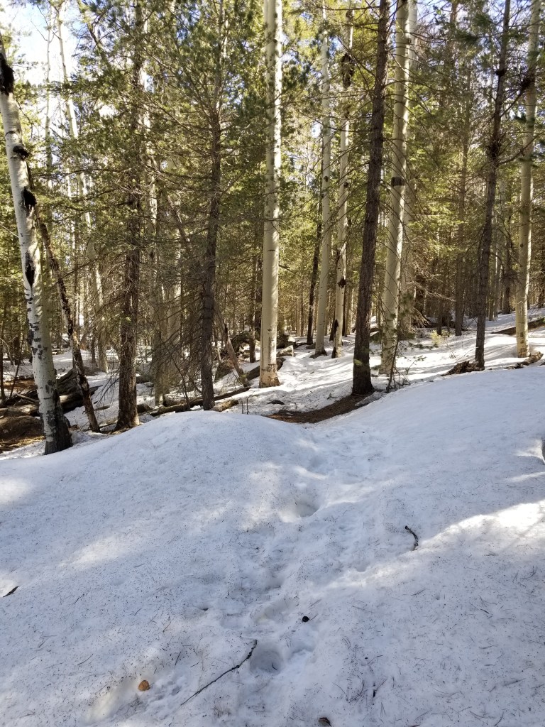 To leave the Flagstaff area the Arizona trail goes up around the snowy San Francisco Peaks and with a clear blue sky as background, they just “pop”. Meanwhile the trail itself goes “crunch” or “squish” depending on the time of day that you cross the lingering snow pack.
