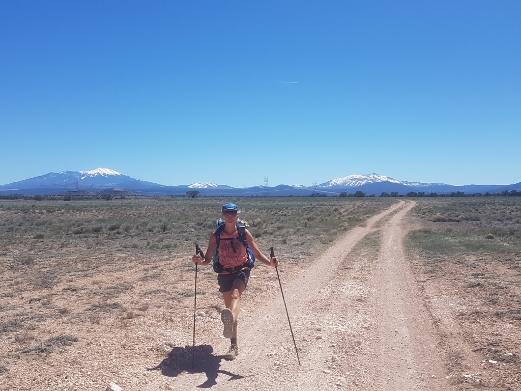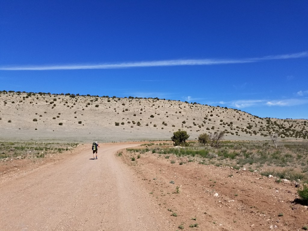 The land levels out around 6,000 ft and the trail becomes a road walk for many miles. Although this provides sweeping vistas and the ability to look up while hiking, the repetitious level steps can be tiresome on the feet and legs. As a hiker you inevitably push your distance on the flat ground.