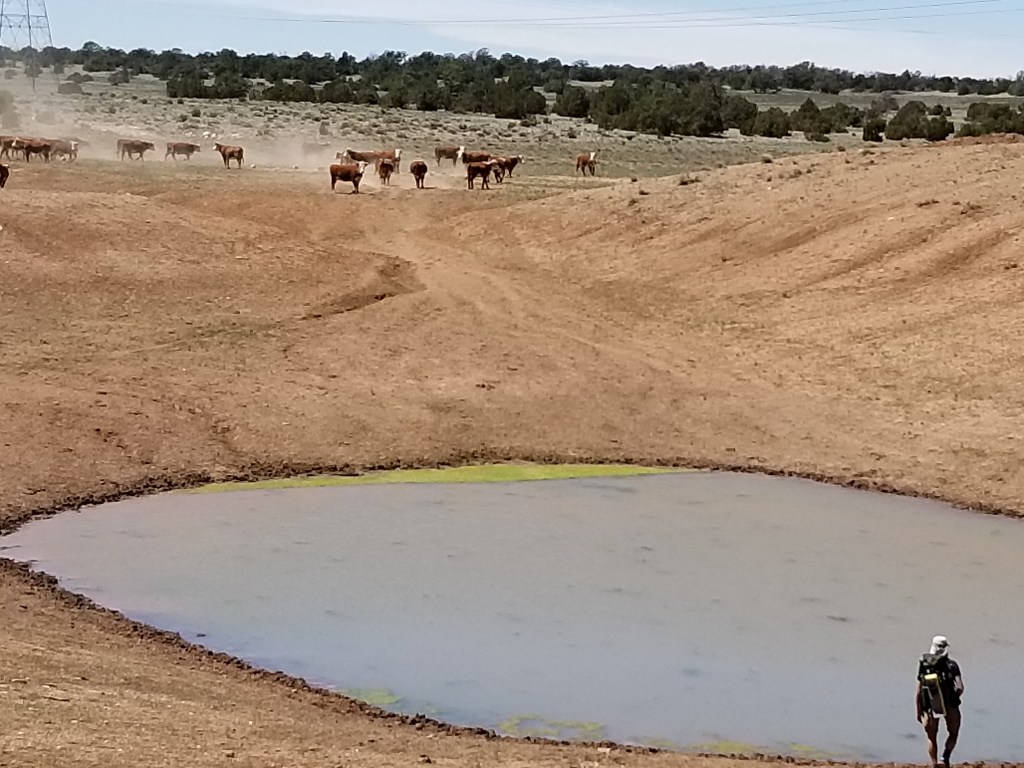 This is the first we are seeing cattle on the ranchland in hundreds of miles. They are both curious and nervous of us. We encounter them most often near the water tanks. One such tank was located in a bull pen and as Jobie was filtering litre after litre of fresh spring water, I heard these continuous grunting/heavy sighing sounds coming from the other side of the dirt birm that edged this area. Eventually the biggest, heaviest Daddy bull with balls hanging down to his knees appeared at the top of the ridge. He snorted and pawed dirt behind him with his forefeet like I imagine happens in bull fights. He heaved his weight, step by swaying step, down the slope grunt/sighing all the way and started heading for the tank where we were. He had BIG eyes and is eyeing us as he approached. While Jobie calmly continued to pump his water, I became nervous and picked up my hiking poles to fearfully shoo this beast away from the tank. As I moved right this bull moved slightly left – so I moved left and he leaned right. At the end of this game, this Big Daddy bull simply walked straight to the tank for a drink ignoring me completely. He kept his eye on us the whole time he slurped. Then he made his weighty way to the other end of the pen. Needless to say I was a little excited and forgot all about taking a photo of Big Daddy. Only Shakespeare could have schemed up such a drama!