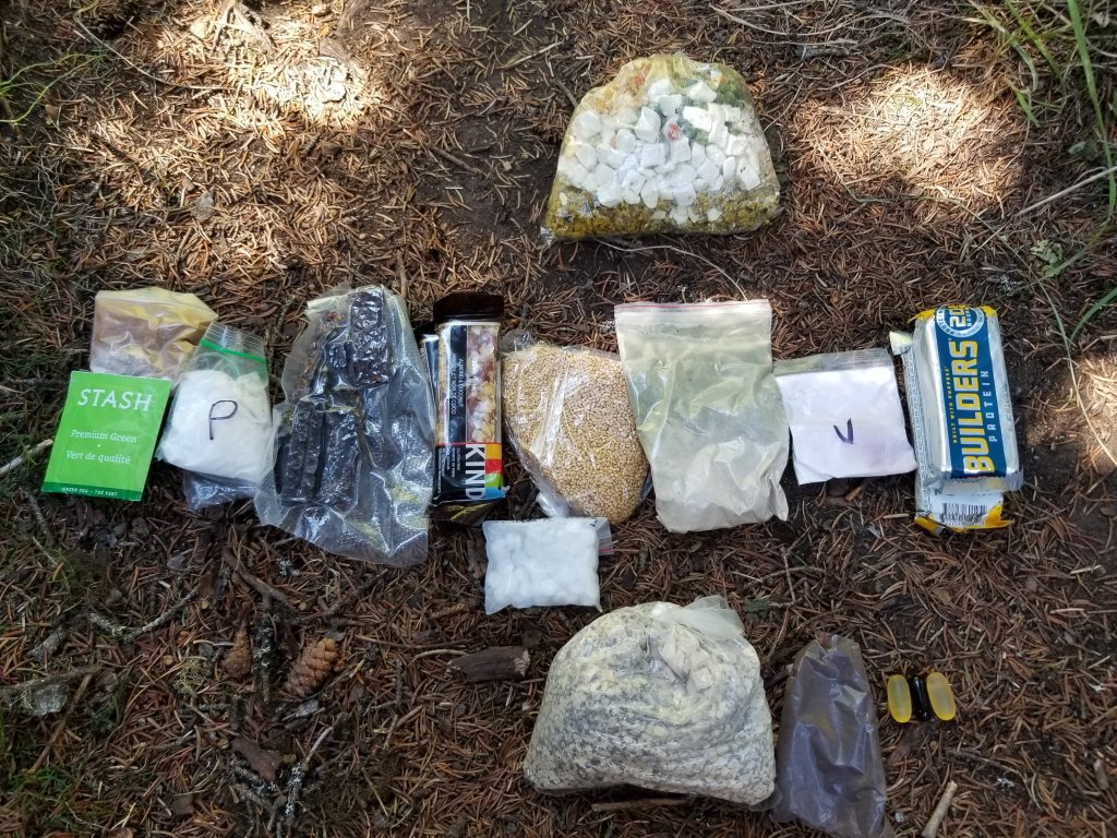 Here is what we eat while on the trail. The bottom row is our breakfast which consists of an oat/chia/protein mix or a dehydrated egg/cheese/potatoe mix or a savoury dried bean mix. We create the mixes ourselves and are perfecting the recipes as we go along. The bag is enough for the 2 of us and along with some instant coffee, and 1 multivitamin and 2 fish oil capsules per day, we are good to go.