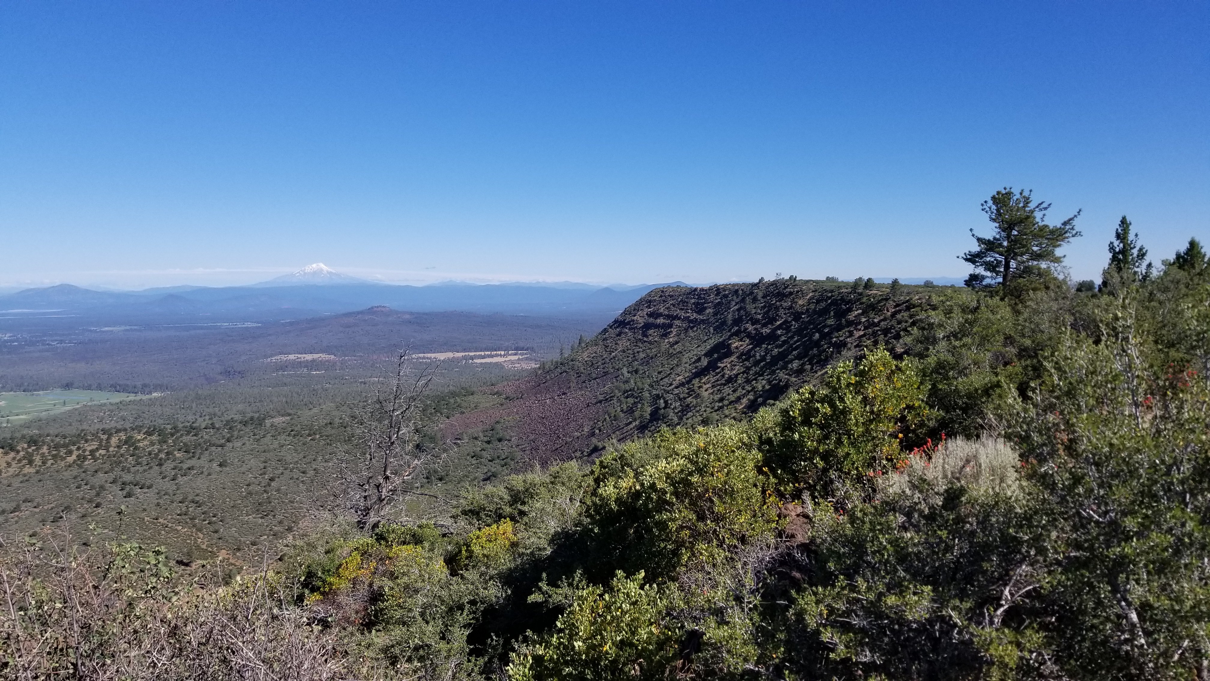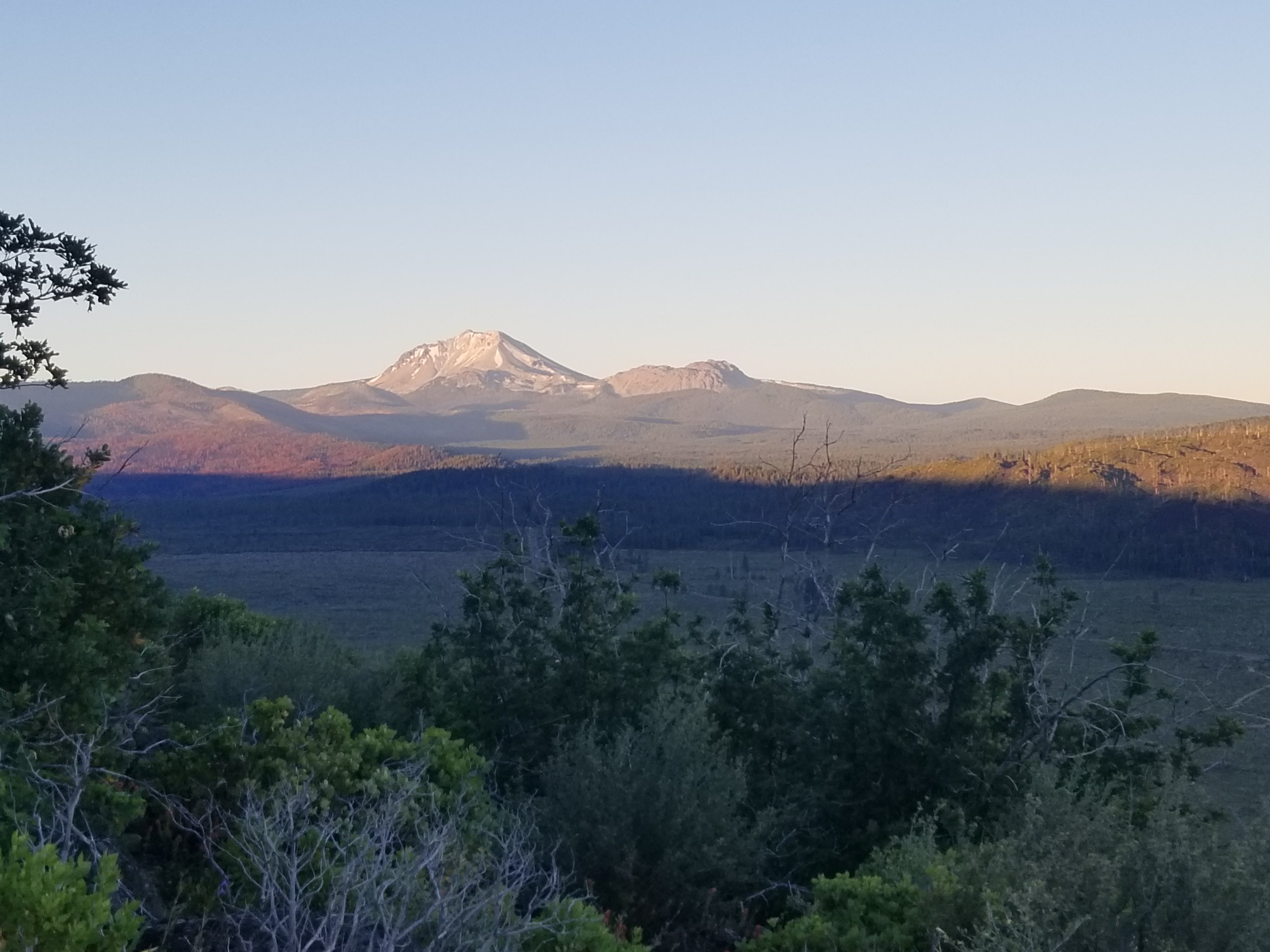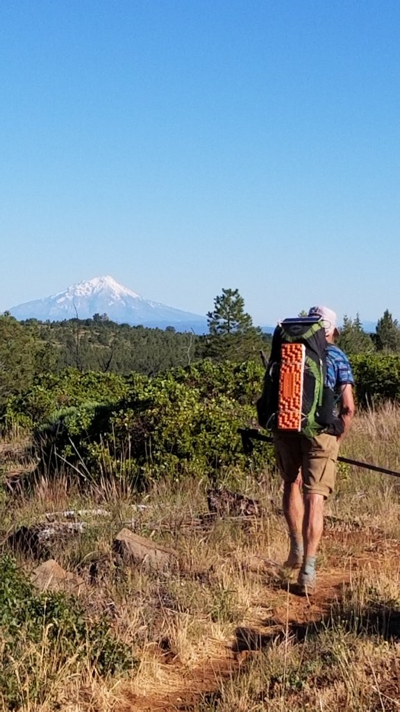 A stunningly scenic part of the trail is the Hat Creek Rim section. A photo can’t contain the drama. Hat Creek lies below a cliff that rims the valley (PCT follows the edge of this rim). Mount Lassen Volcano busts upward at the southern end of the lowlands while Mount Shasta with its cone shape and forever snowy top at the northern end. All day you feel large as you hike along this grand view.