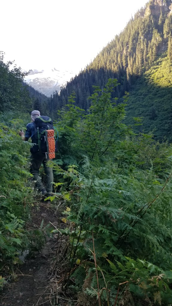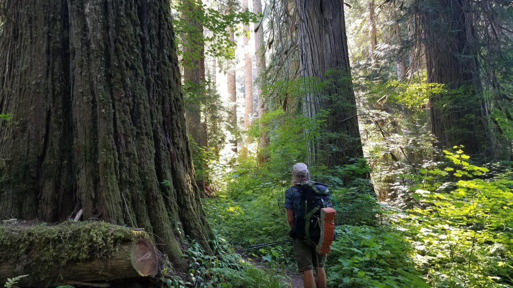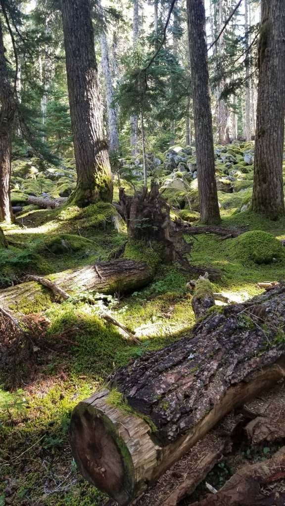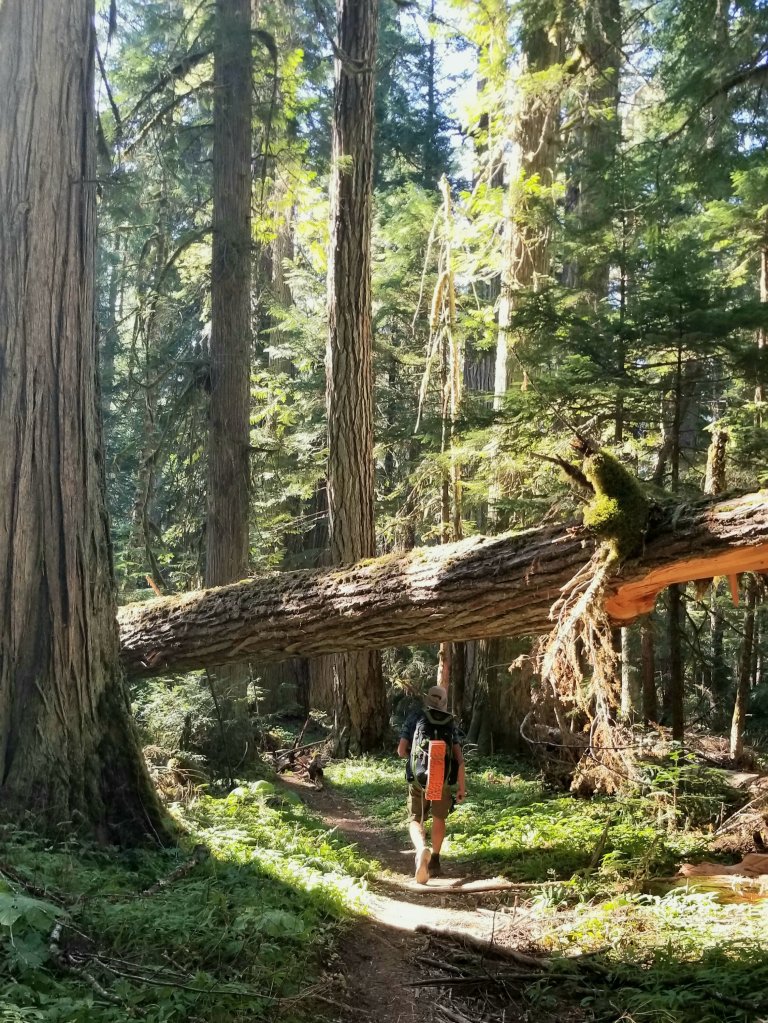 In pockets there remain protected old growth of firs and cedars along the Suiattle River. You feel hushed with awe as you pass them by, and oh so small. When these big trees blow down they create jungle gym scenarios involving heaving your body up, over and under to get around them.