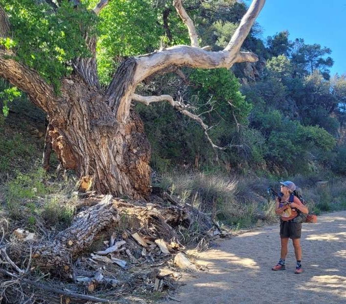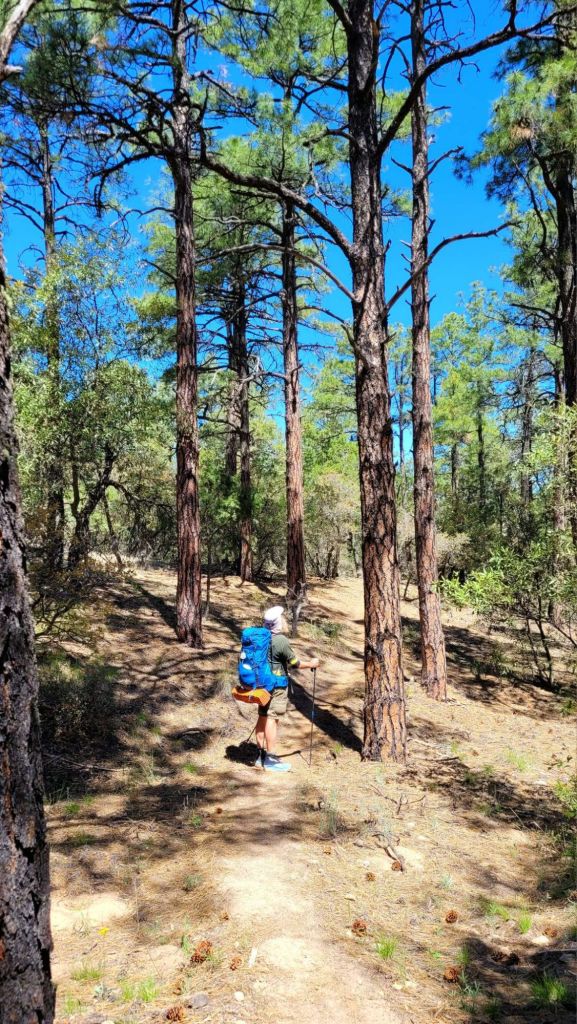 Out of Lordsburg the desert plains slope ever so gently up 1,000′ to the distant hills. Within just a few miles the surroundings change to include juniper trees, small then medium sized, and quickly to huge ones that are cut for lumber! Pine trees and oaks appear. We are in a new world as we follow the hilly trail up and around the ruins of a gold mine. Meandering we make our way through these hills seeing fewer hikers than cows on the way to Silver City. Here we will pick up our resupply box from the post office and take a zero at an Airbnb.