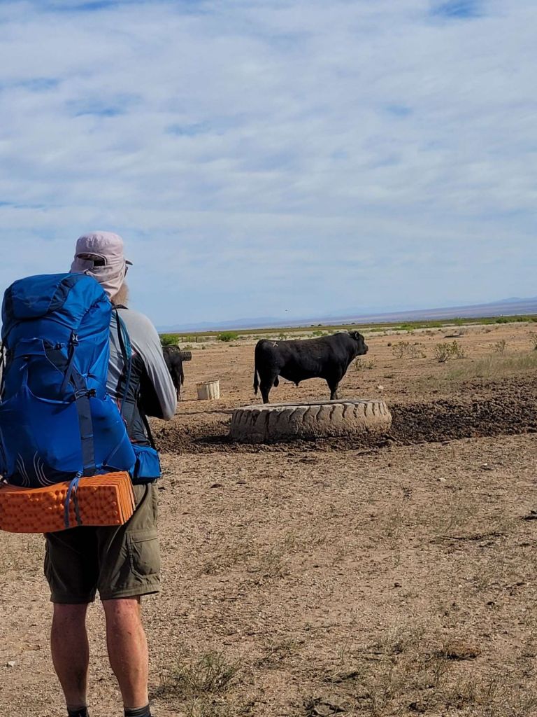 Cattle are scattered throughout this desert. (What do they eat??) Water sources are shared with them but at this one, the bull didn’t understand the concept. He pawed the dirt and stood his ground, grunting and staring us down. We were not getting any of HIS water! Reluctantly we moved on…