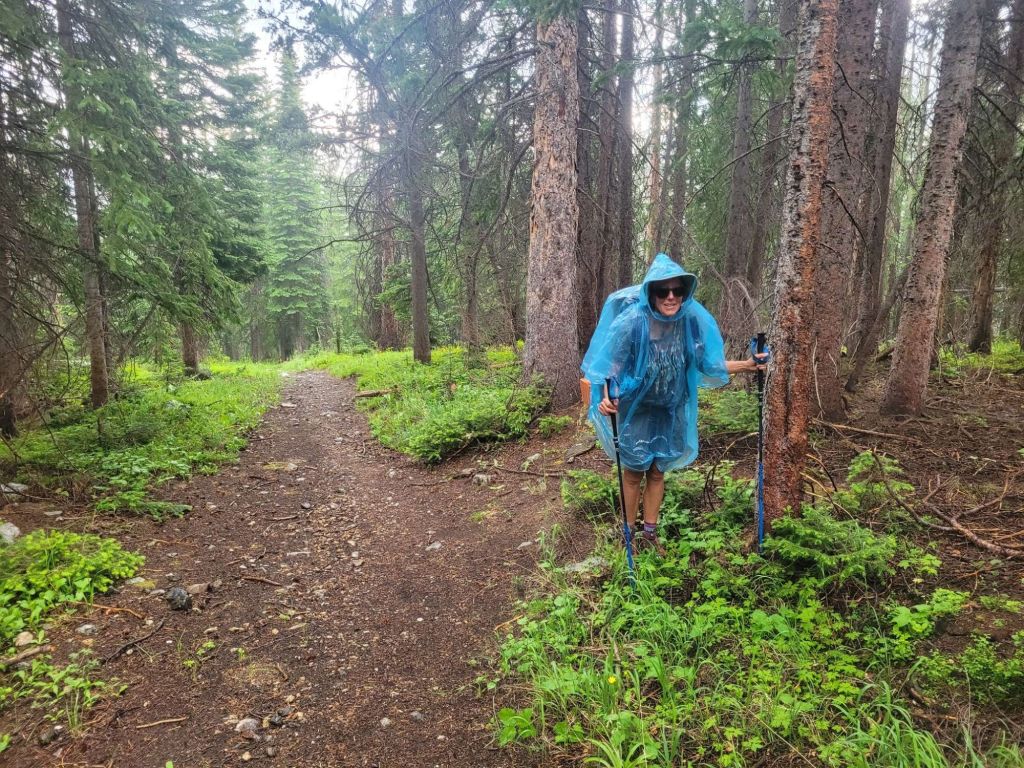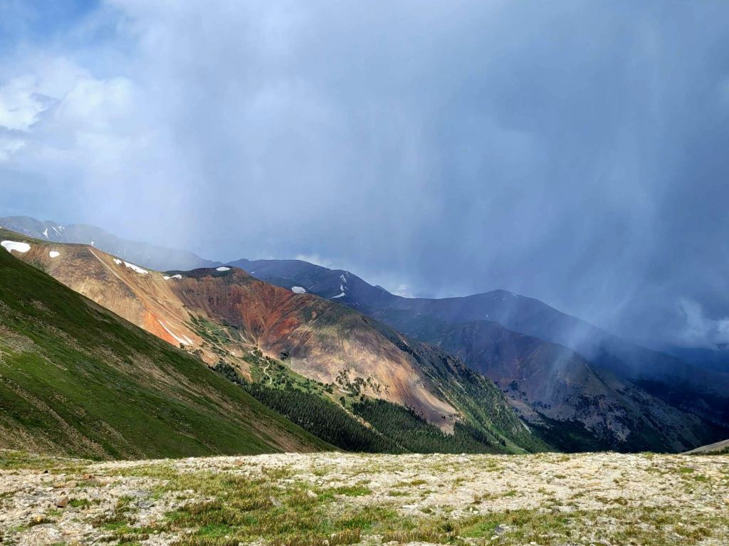 The following day we climbed up and over Mt. Flora and hiked through a welcome comfortable treed trail before the climb to James Peak. The trail was defined and easy to follow in the alpine tundra after a few miles of scrappy, sweaty forest climbing. As we were descending we met up with the first CDT hiker that we had seen in days, Jamie. Together we noticed the sky turning black and angry again. We all decide to boogie along the trail which traversed the backside of where the storm was brewing. The lightning began about an hour later and we plunked ourselves down at the bottom of a grass slope and hoped for the best. It began to hail with the thunder and lightning! These chunks of ice were the size of thumb nails! They were bouncing all around us like popcorn in a hot pan. Jamie used her umbrella for protection while Jobie and I held our foamies over our heads and down our backsides. The hail hurt without these shields causing us all to curl up smaller. After 15 steady minutes the hail was a white dotted coat on the ground but the thunder was still sounding off.
