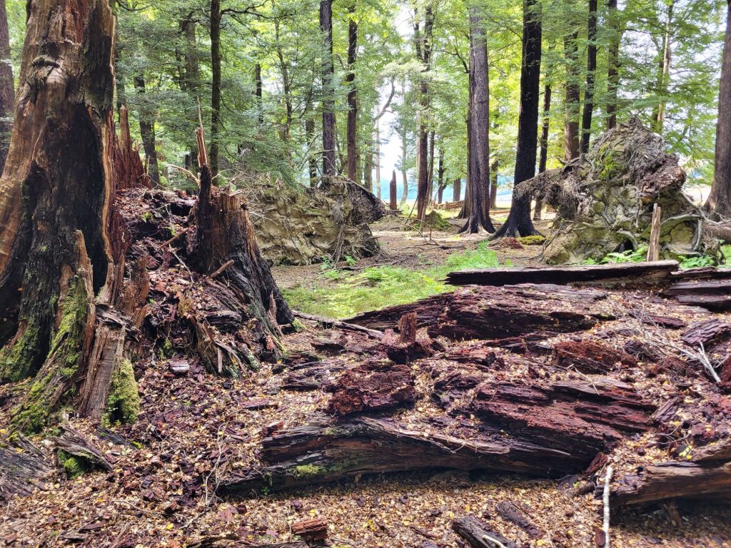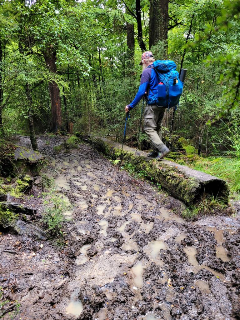Once at the top, we decided to put in another few hours that day and descend to Deception river below. If we had known what we were getting into would we have done this?? The descent is called “Dr. SEUSS GULLY” and you move your way down a small, bouldery creek with running water and dropoff waterfalls. There is no soil edge on this part of the trail just boulder rocks in a sharp decline. Being short legged I often had to sit down on one boulder while I reached my leg as long as possible to find a lower boulder to shift my weight to without toppling over. Fortunately, the rocks were not slippery. This short stretch of distance took us 1.5 hrs. to manage. Despite the late afternoon sun, my sense of humour vanished with the tedious nature of careful foot placements. It was only after we arrived at our nesting place for the night that we could laugh at how ridiculous that adventure was. We got Seussed!!