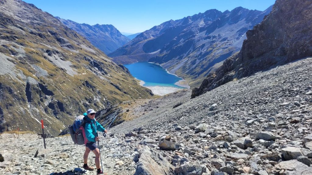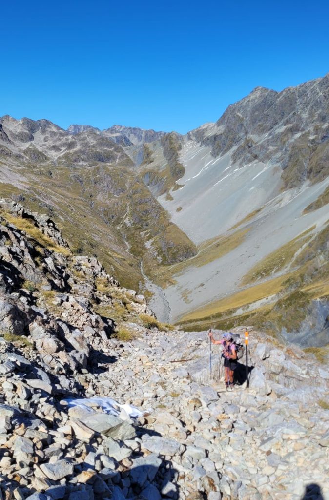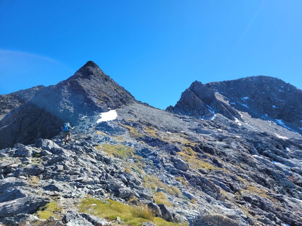 Most passes or climbs have a character to themselves and this one is no different. This is what Jobie called a “Doozie”. The top of the climb included 100m of straight steep rocks then 100m of rock scramble where you ditch your poles and use both hands and feet to leverage your way up. Fortunately, the steep dropoffs weren’t immediately at the trail edge! I would not have wanted to do this in the snow from last week!