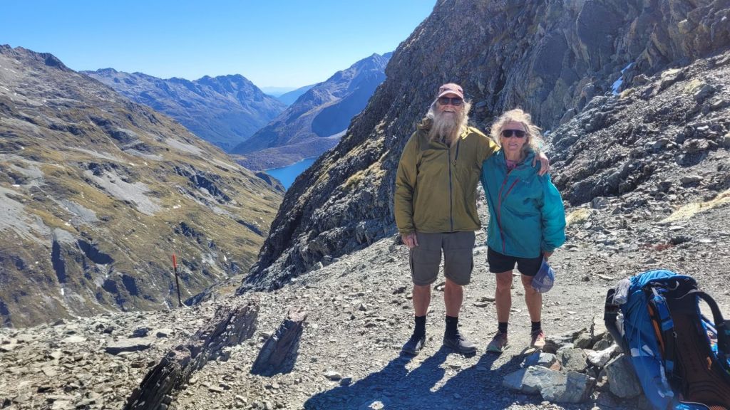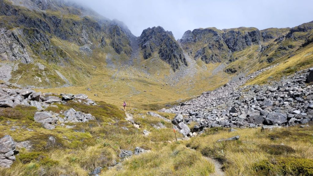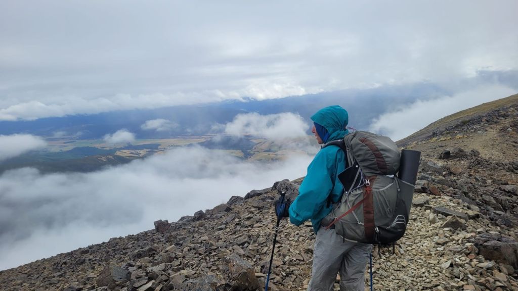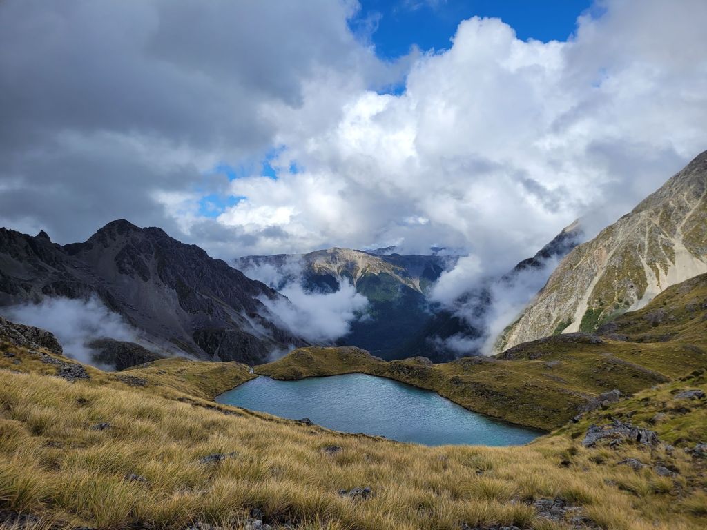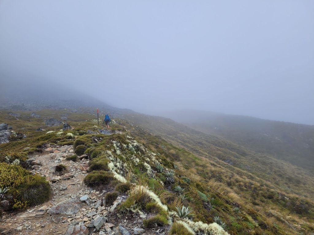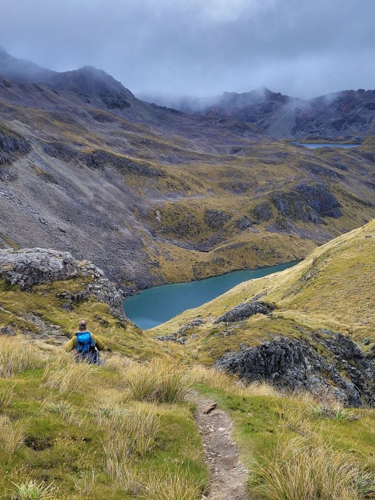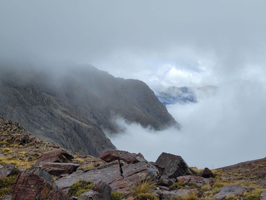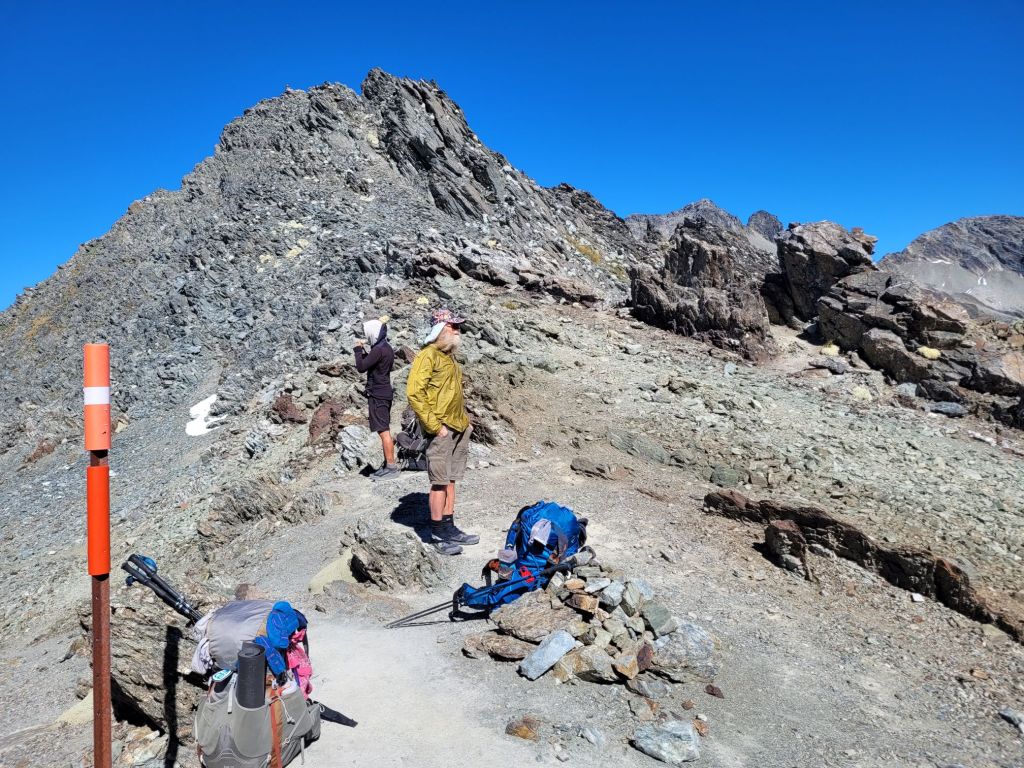 The next 2 passes are cloudy experiences. Travers was an uphill slog for several hours with no views until the top. Marvelously the skies broke open – we were so lucky!