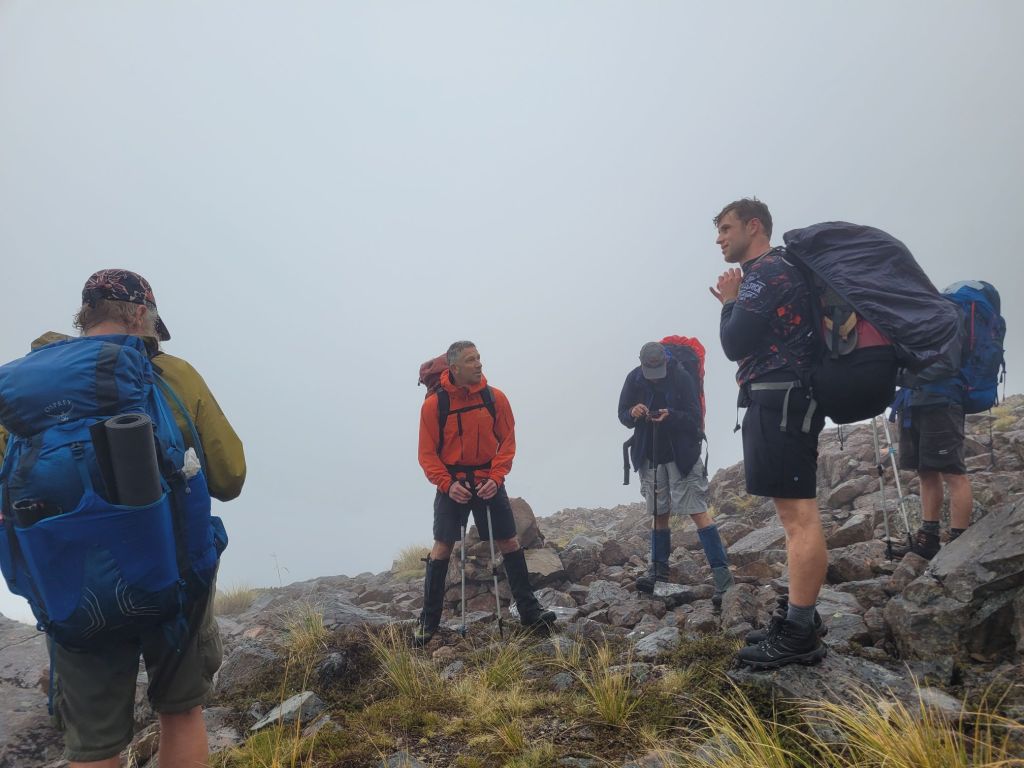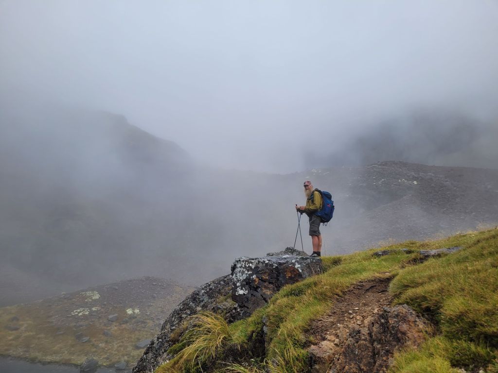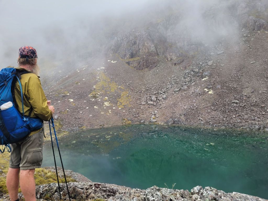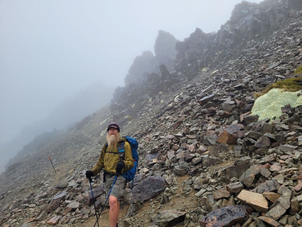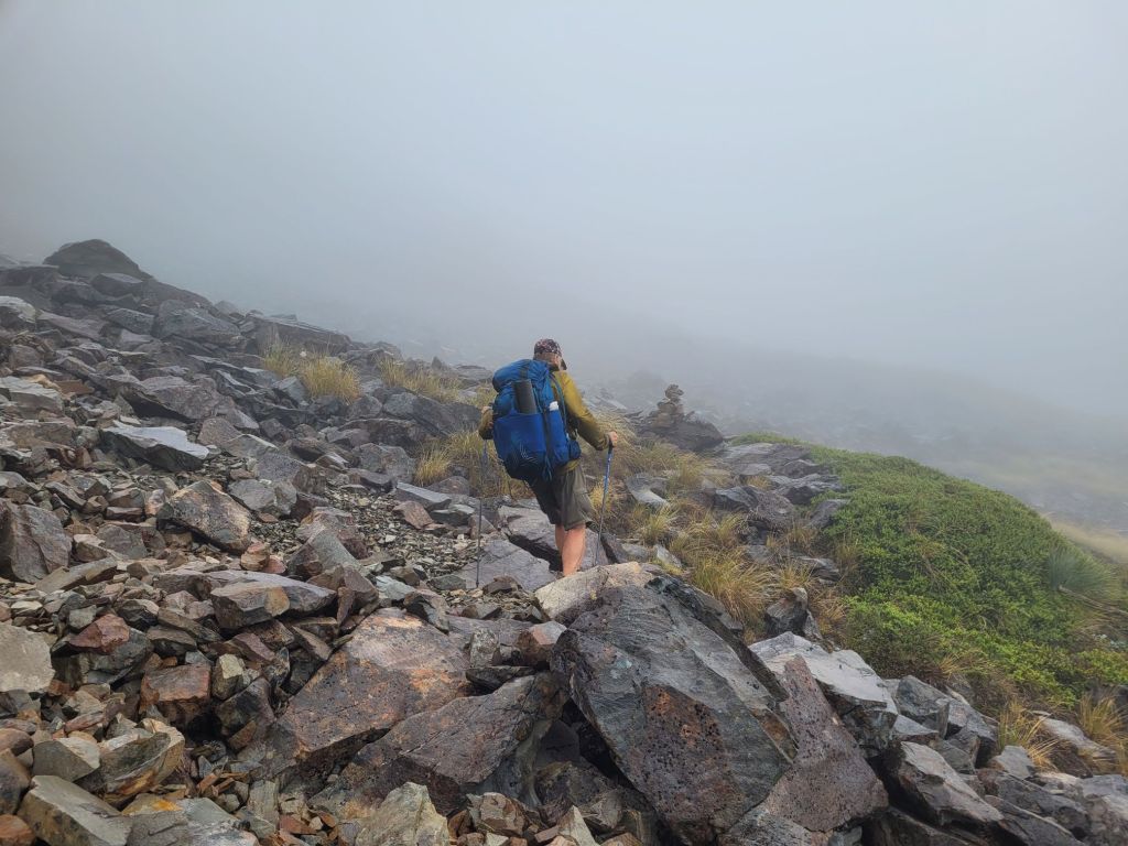 Our last pass in this section is the Sunset Saddle but it clouded in tight and, being a route not a trail…there were scattered cairns to follow. With low visibility this became difficult. The steep loose scree added a level of difficulty. We came across a group of hikers who were off trail. Collectively we managed together to find the way.